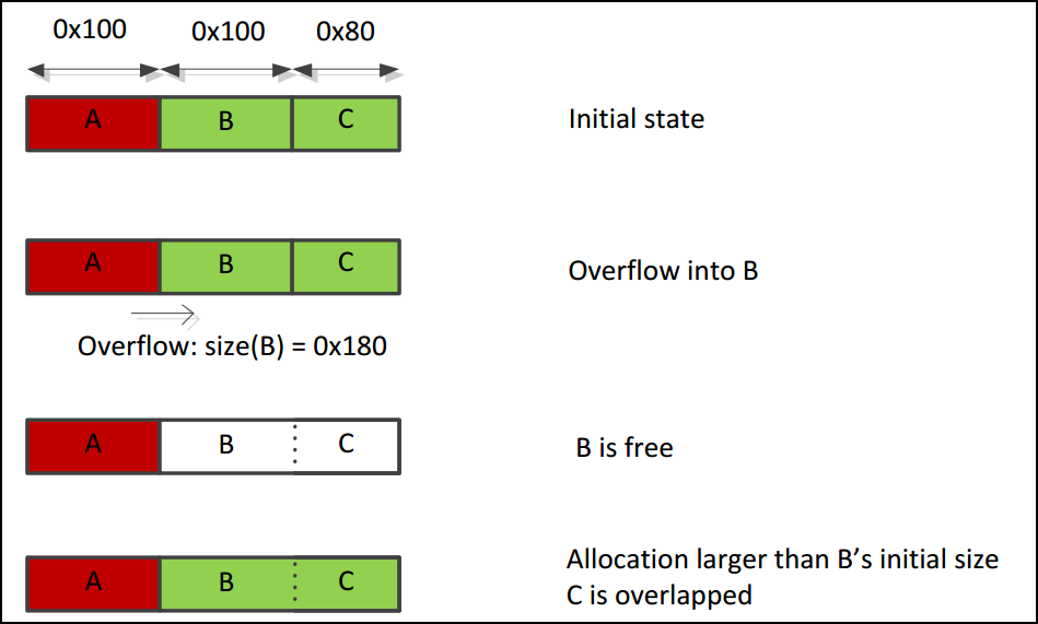 此时B1堆块空闲,满足向前合并的条件,所以B和C两个堆块被合并然后链入freelist,此时再申请合适大小的堆块,就可以覆盖到B2,产生堆块重叠